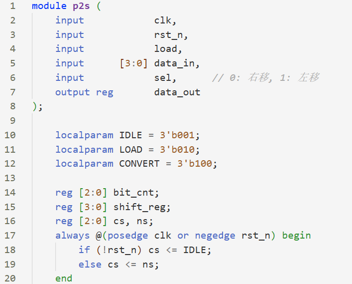 这里使用状态机来实现(方法不唯一),定义三个状态:IDLE、LOAD与CONVERT,其中处于LOAD状态时载入并行数据,在CONVERT状态进行并串转换: