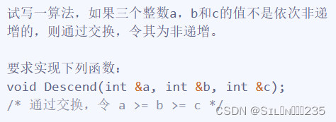 void Descend(int &a, int &b, int &c) // 通过交换,令 a >= b >= c