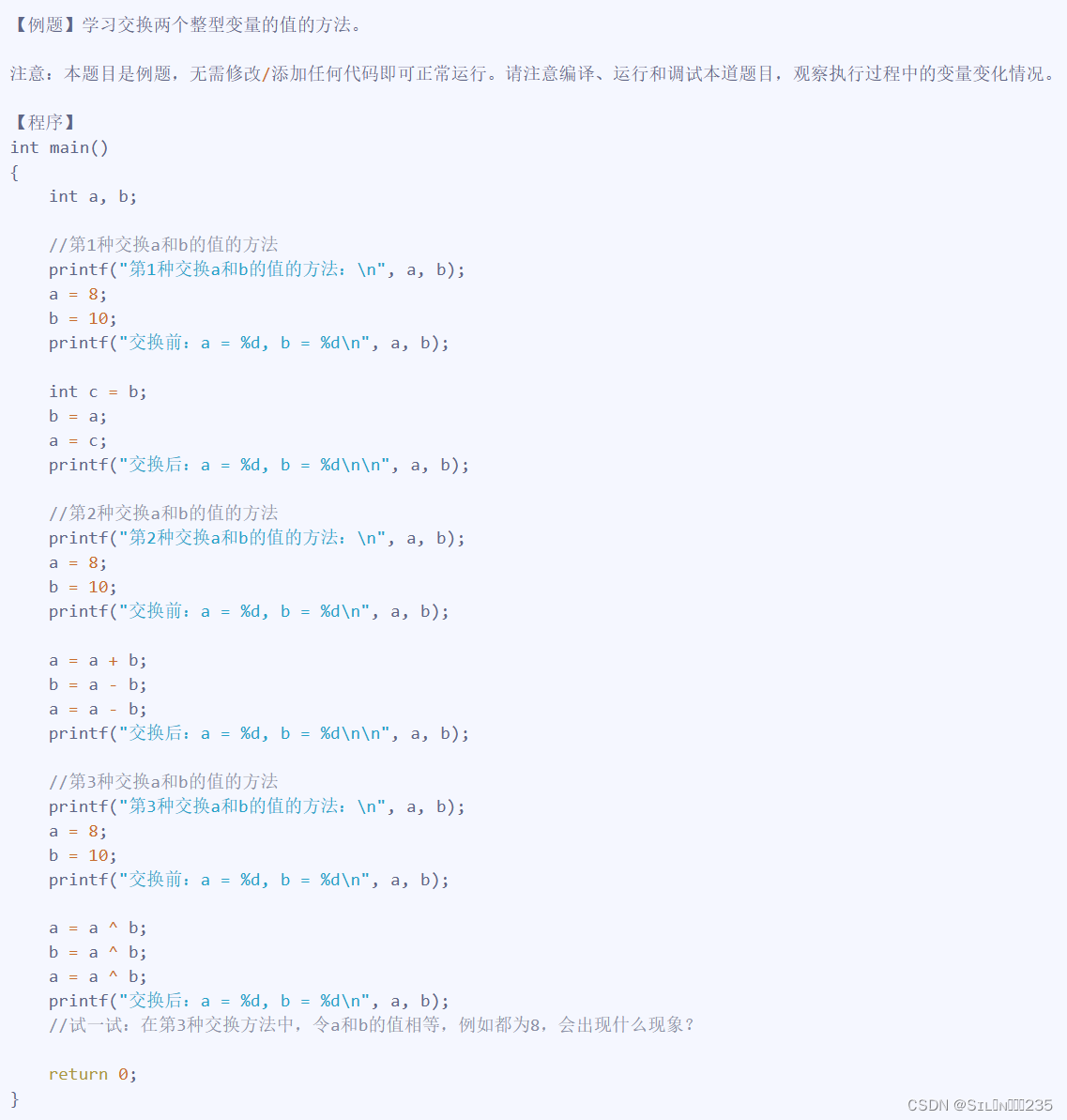 //试一试:在第3种交换方法中,令a和b的值相等,例如都为8,会出现什么现象?