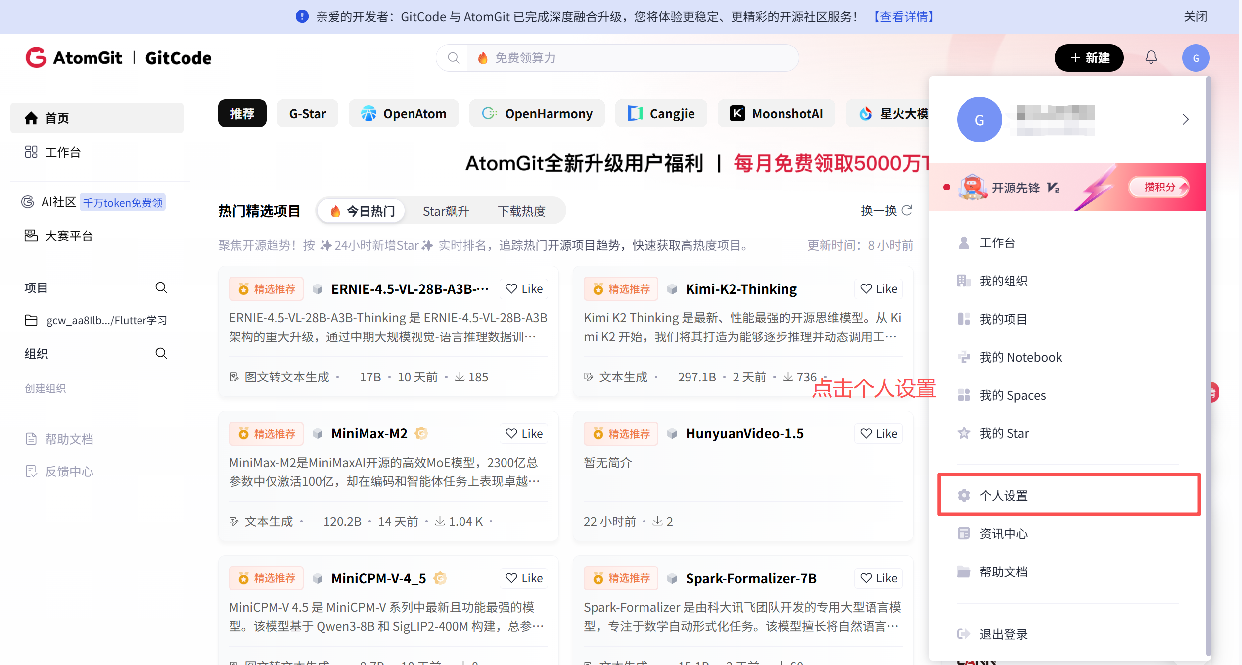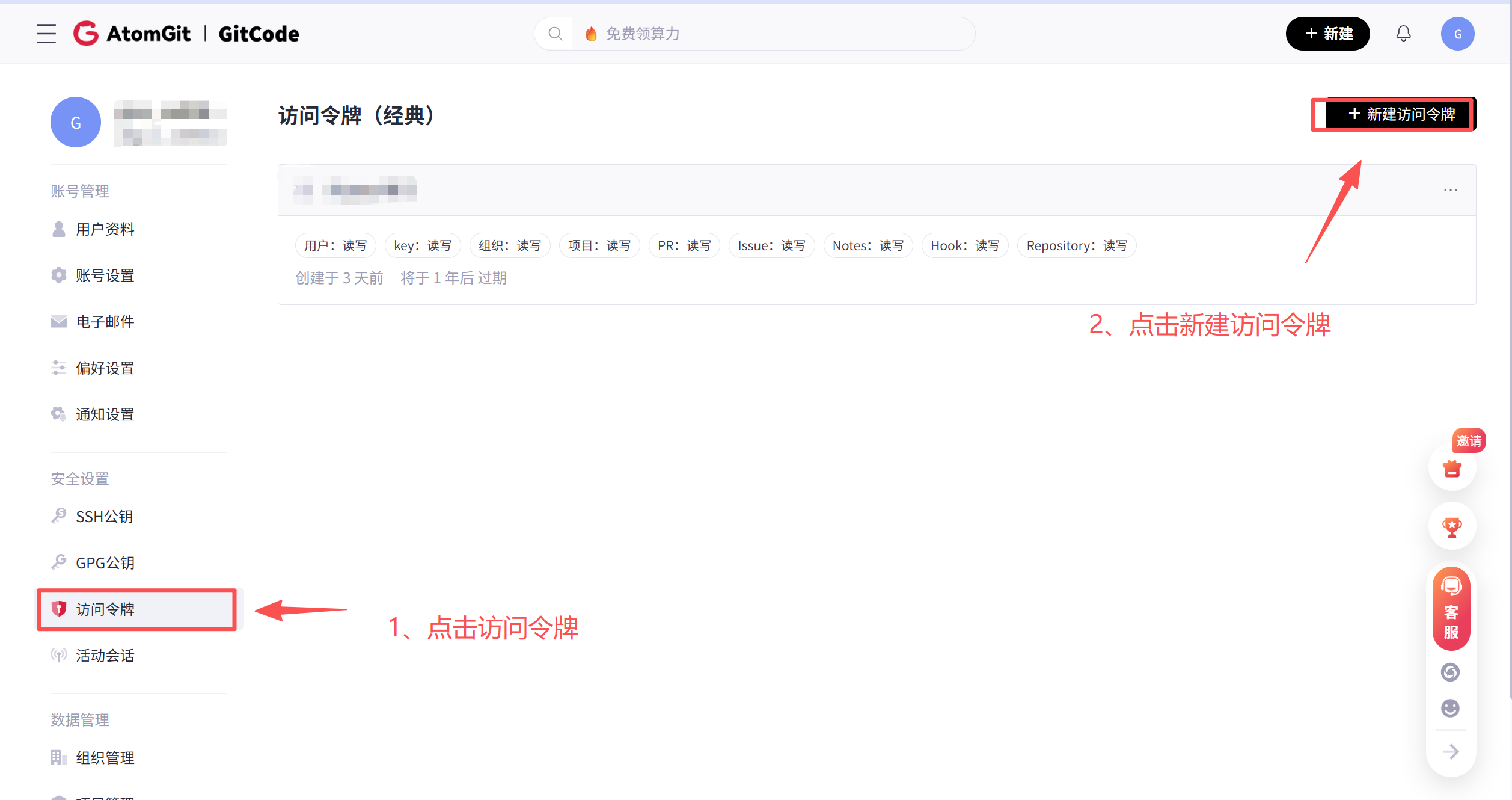 可以发现无论是搜索仓库还是搜索用户,都需要有用户授权码,那么我们需要在 GitCode上创建一个用户授权码: