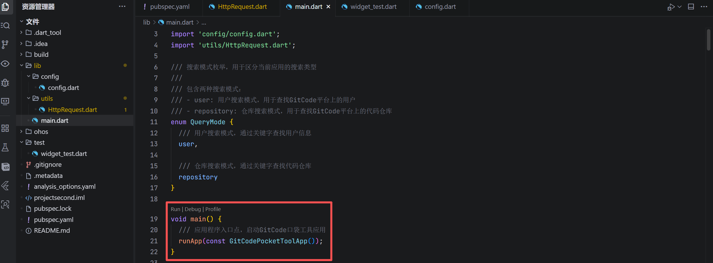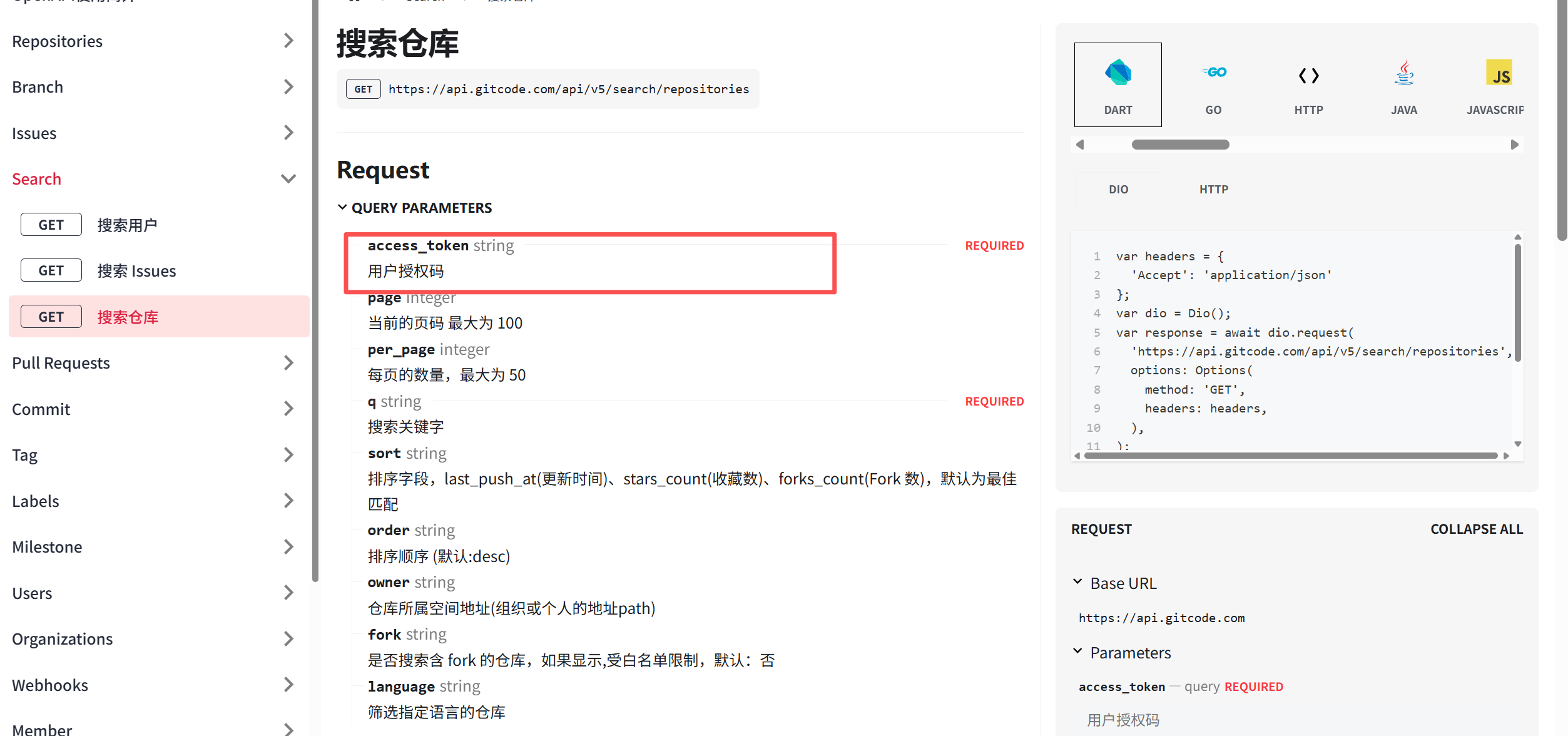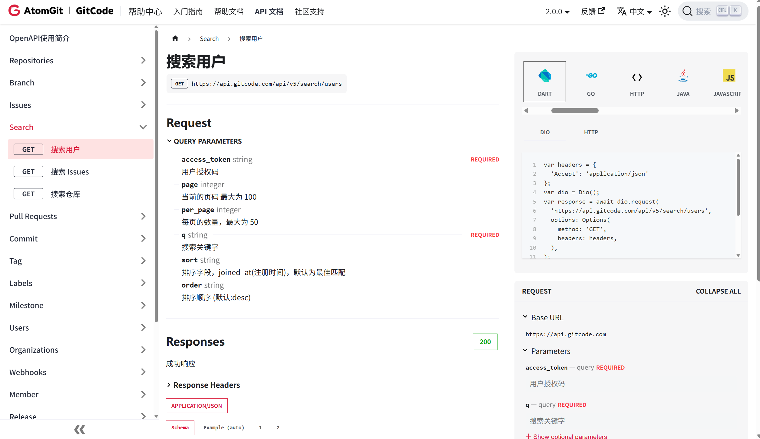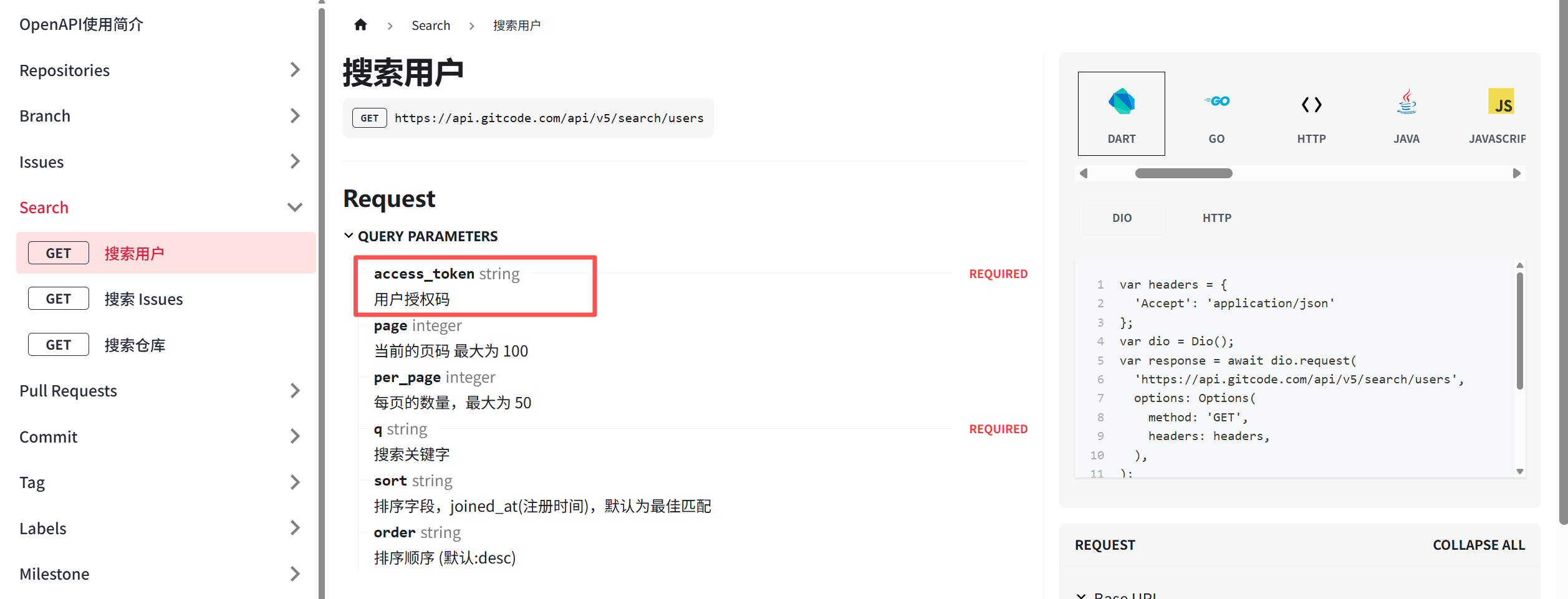 因为我们的 flutter 工程是使用的 Dart 语言,所以我们只需要关注 Dart语言的开发示例即可。然后再看一下GitCode提供的接口: