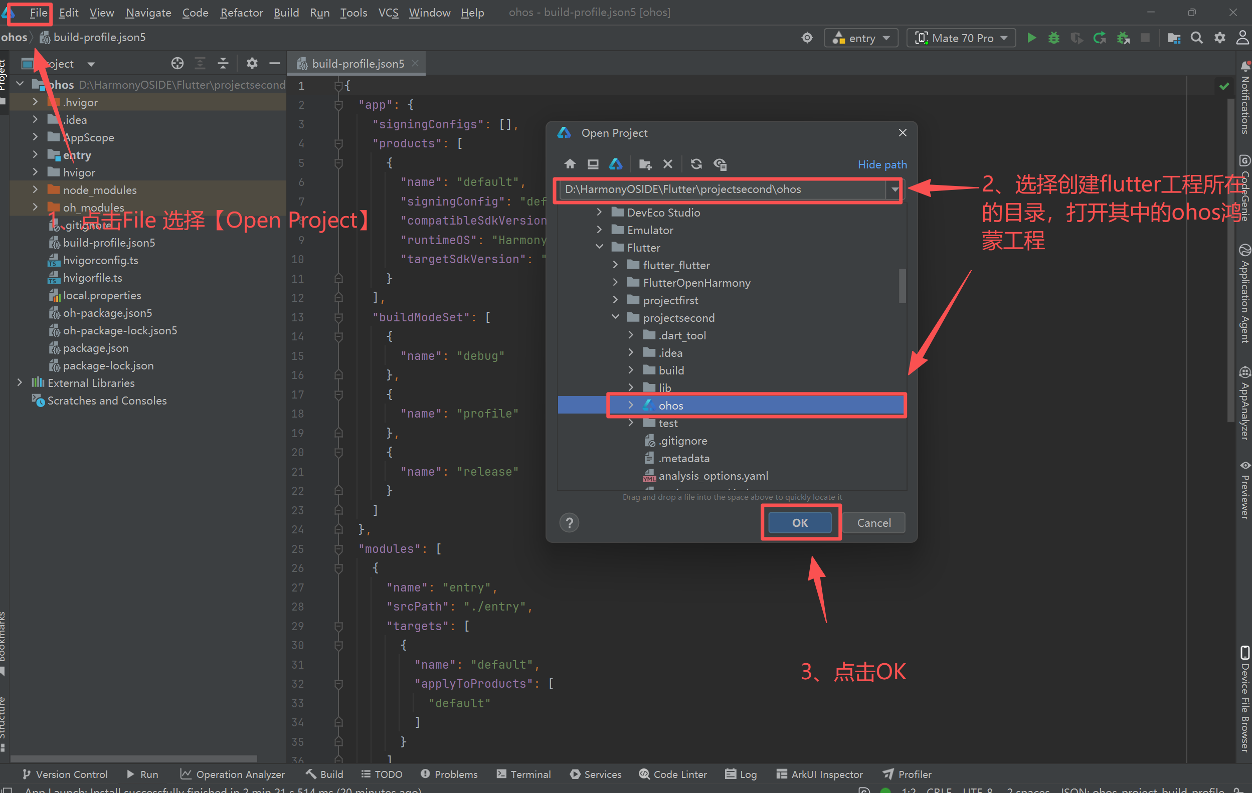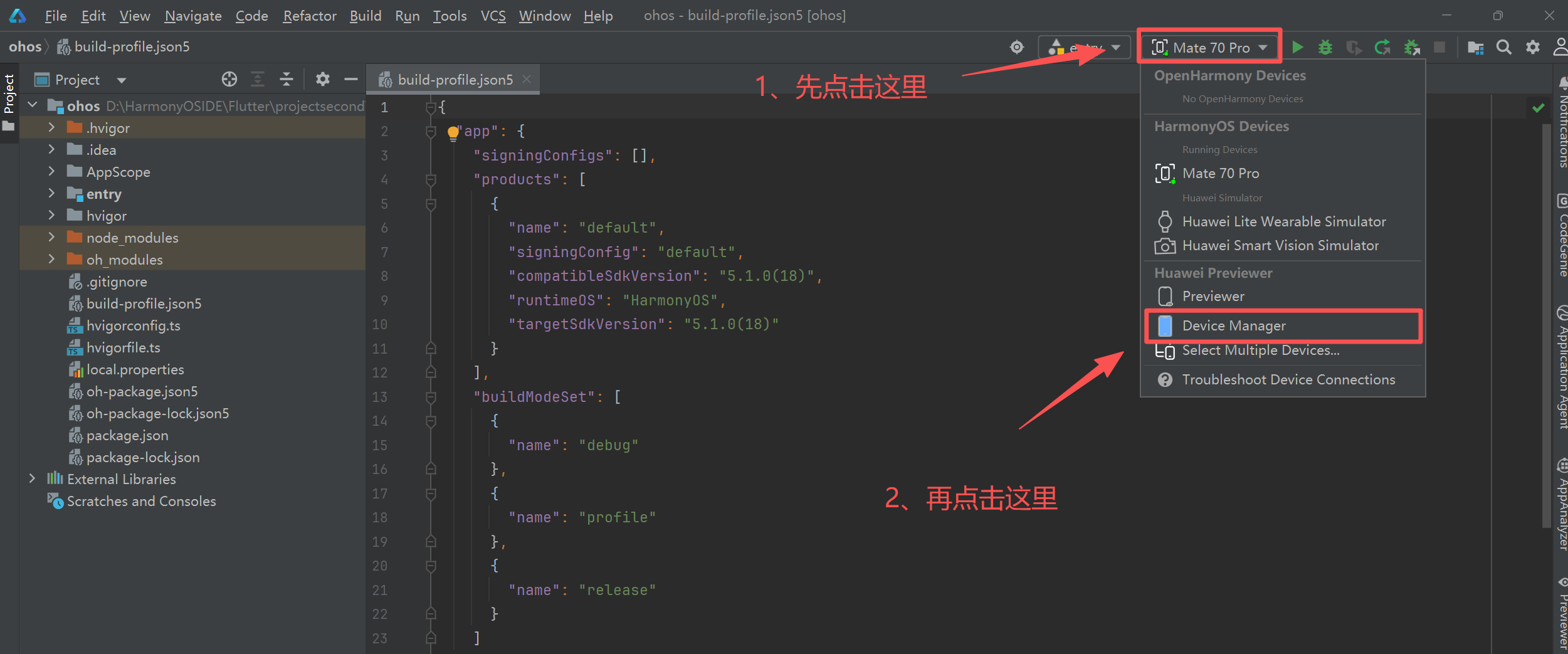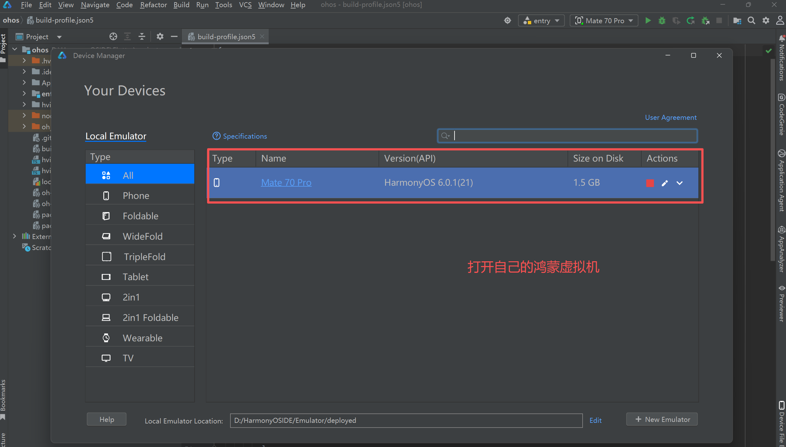 使用 DevEco Studio打开 ohos 鸿蒙工程文件夹,并且打开鸿蒙虚拟机: