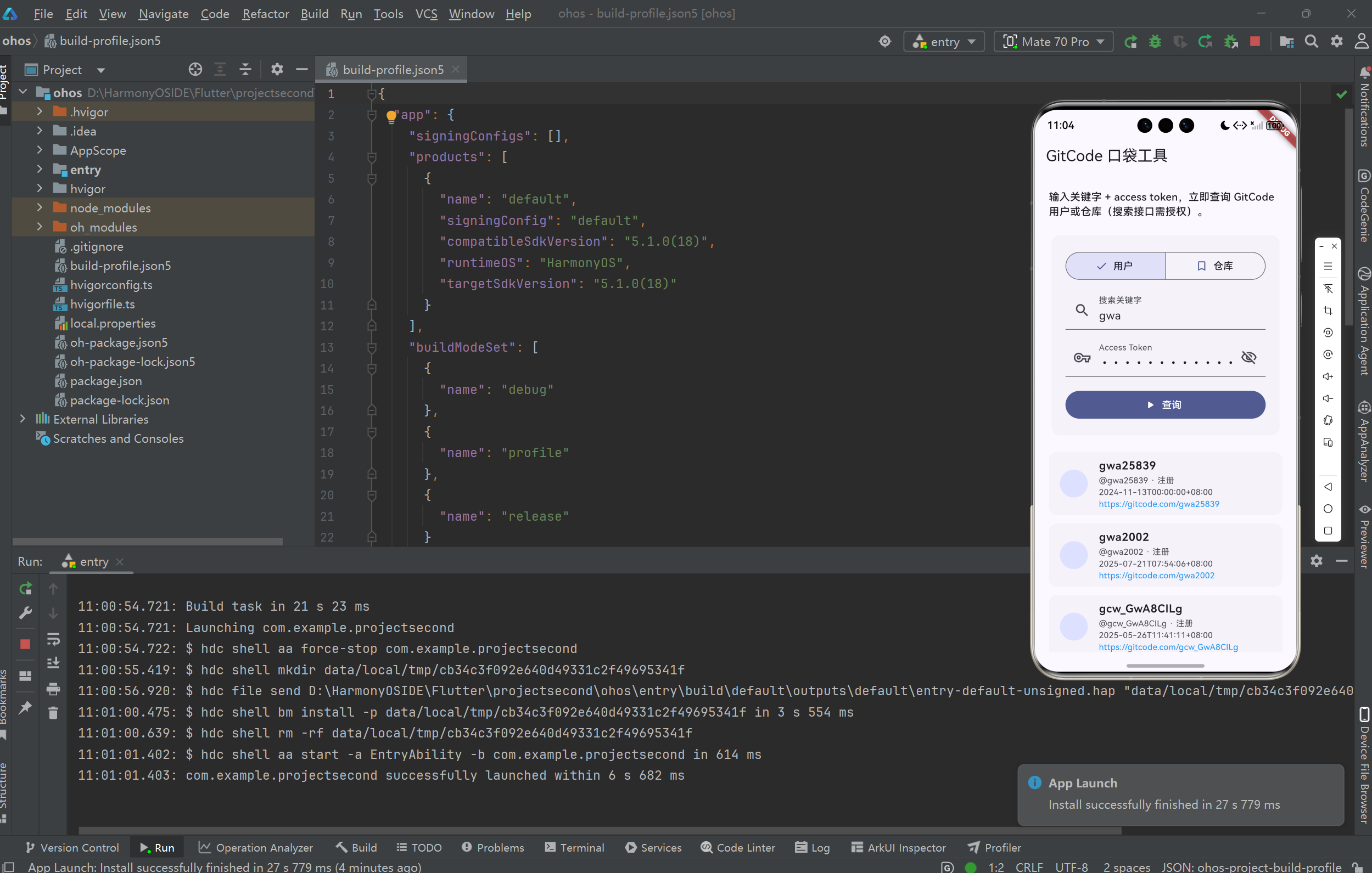 编译完成之后打开 DevEco Studio 启动该Flutter项目下的鸿蒙工程,即可检查效果: