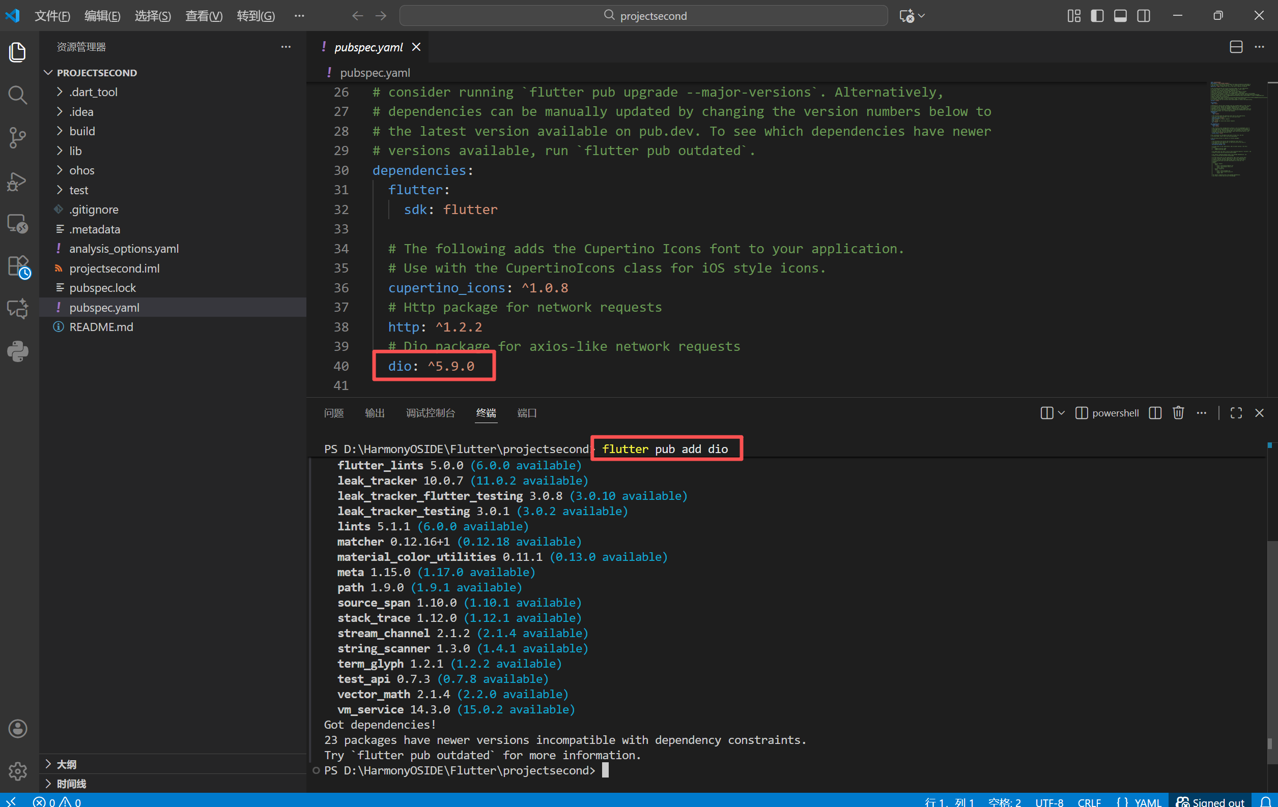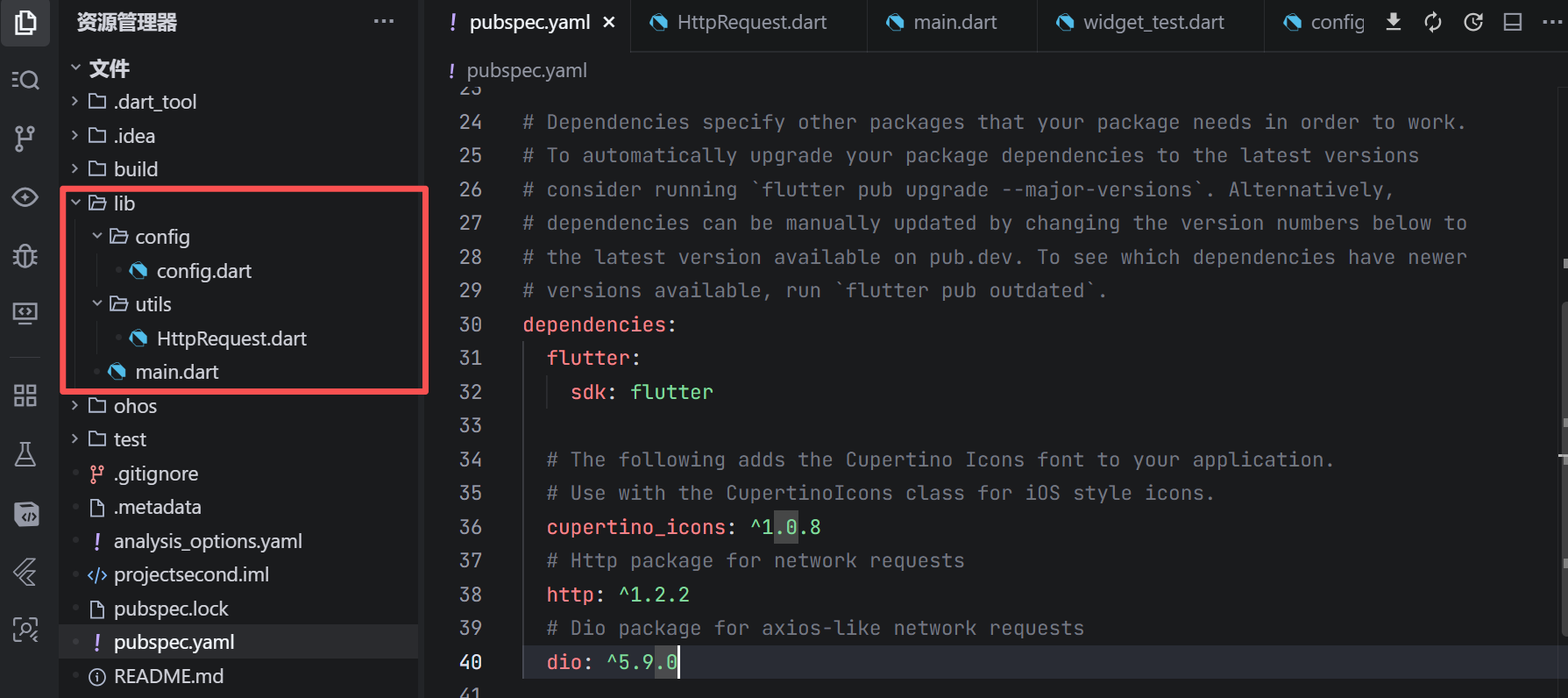 导入 Dio 库,并在pubspec.yaml 配置文件中查看Dio库是否导入完成。