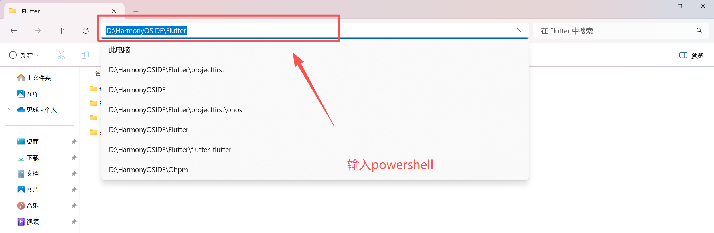 假设之前已经配置好了关于 flutter 和鸿蒙的环境(没有配置好的可以看我其他文章),在代码保存目录下输入 powershell 进入命令行: