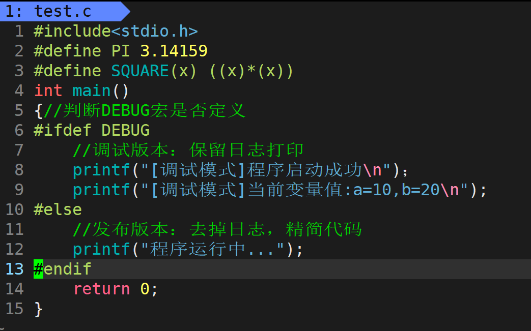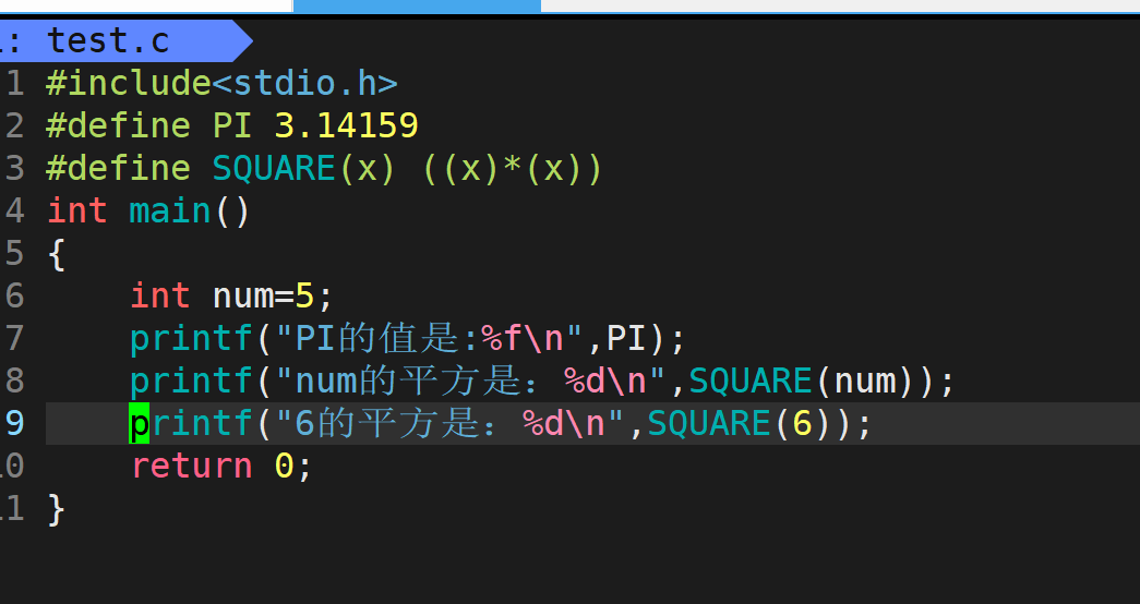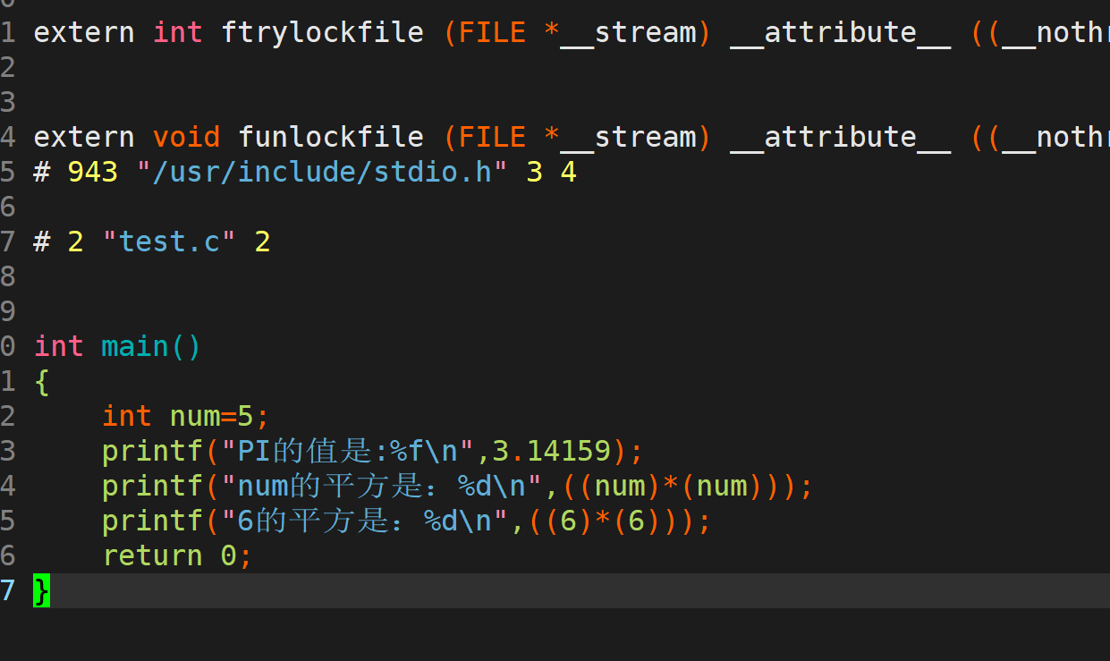 gcc -E是用来进行与处理的指令,是将.c文件变为.i文件,预处理后会将stdio.h头文件中所有内容插入到test.中(这部分内容很多,这里省略大部分,只看和我们代码相关的部分)。可以看到PI被替换为3.14159,SQUARE(num)被替换为((num)*(num)),SQUARE(6)被替换为((6)*(6))