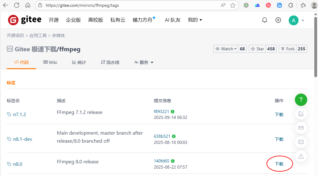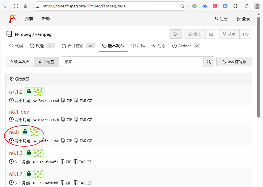 这里我选择下载8.0版本。但是下载会报错,估计是网站问题,可以从Github镜像上下载,也可以从Gitee镜像上下载,Gitee是国内网站,所以我选择它,Gitee下载更快更稳定:https://gitee.com/mirrors/ffmpeg/tags,截图如下: