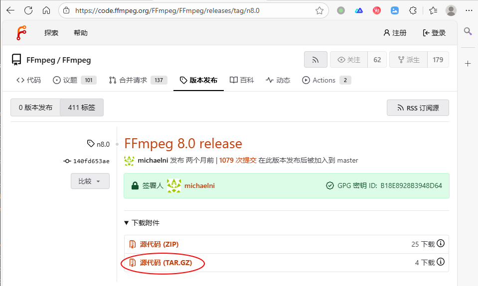 Bug我也在FFmpeg官方提了,没想到第二天就有国内大神修复了,感兴趣的可以去看看:靠bug运行的程序之二------FFmpeg drawtext。大神已经把修复提交上去了,所以大家也可以等新版本,再有新的8.x版本应该就是已经修复Bug的版本了。目前官网上只有两个8.x的版本,如下:
