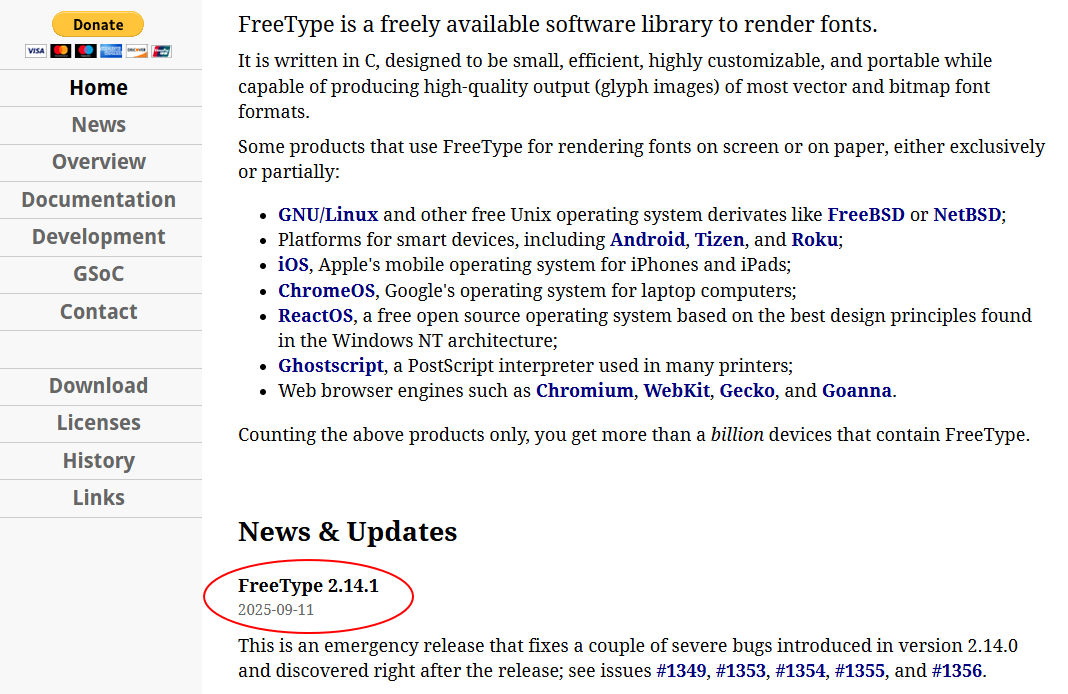 FreeType官网:https://freetype.org/,在首页,它显示了当前FreeType的最新版本为2.14.1版本,是2025-09-11发布的,如下: