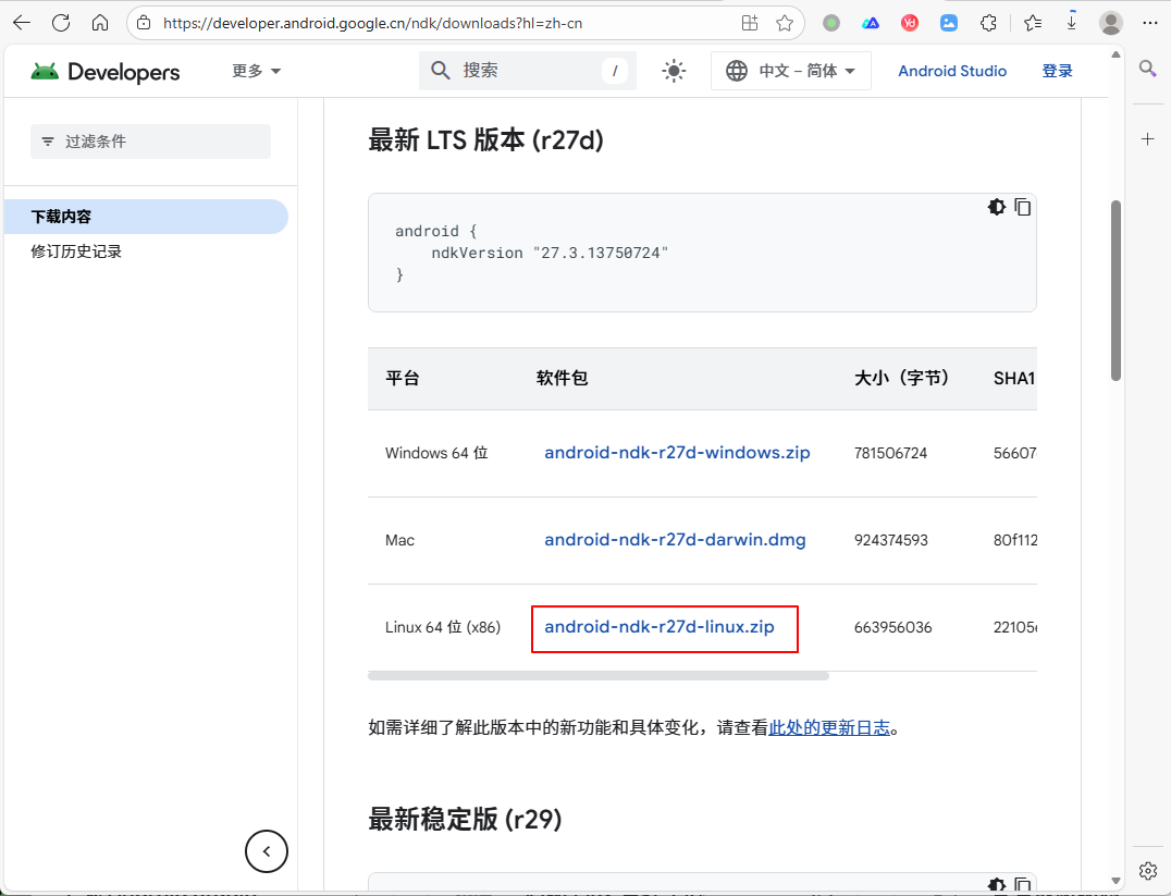 最新的稳定版本是r29,但它并不是长期支持版本,所以我选择下载r27d版本。