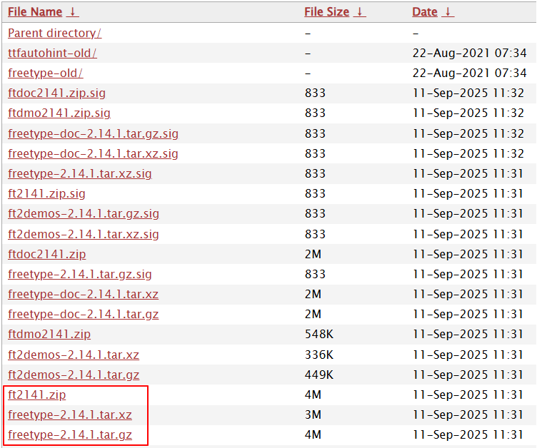 xz压缩格式,比gz压缩比高。所以我选择下载这个。 - freetype-2.14.1.tar.gz Linux平台下使用的,使用