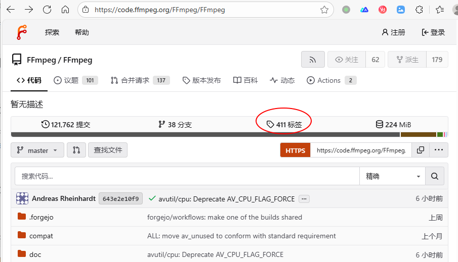 FFmpeg的代码并不托管在Github,Github上面的只是一个镜像,官方代码是托管在:https://code.ffmpeg.org/FFmpeg/FFmpeg,这是FFmpeg自己的官方代码托管网站,所以,如果发现有Bug,可以在这上面提,而不是在Github上。有点神奇,这个官网竟然支持中文。点击 "标签",可选择需要的版本来下载,如下: