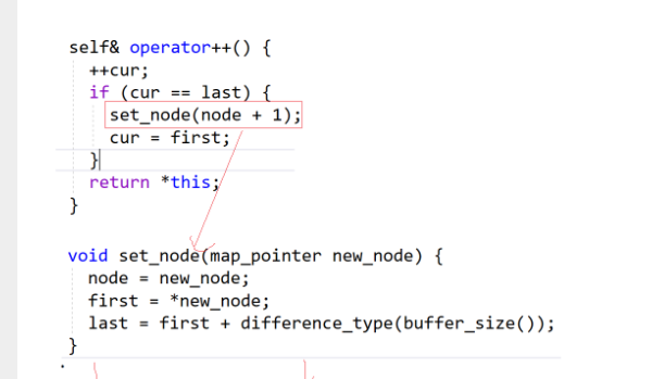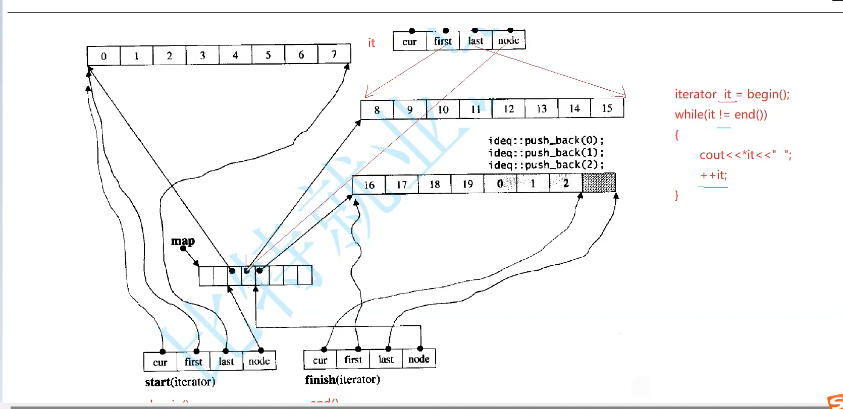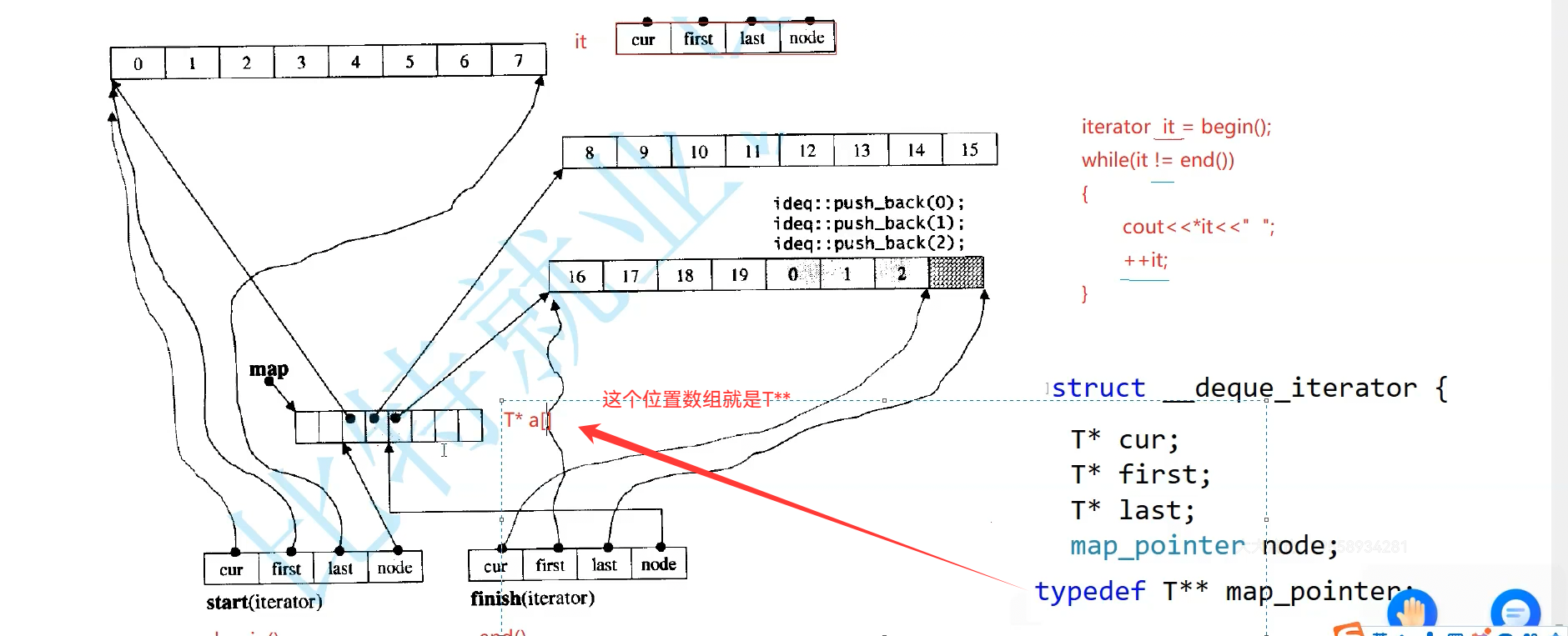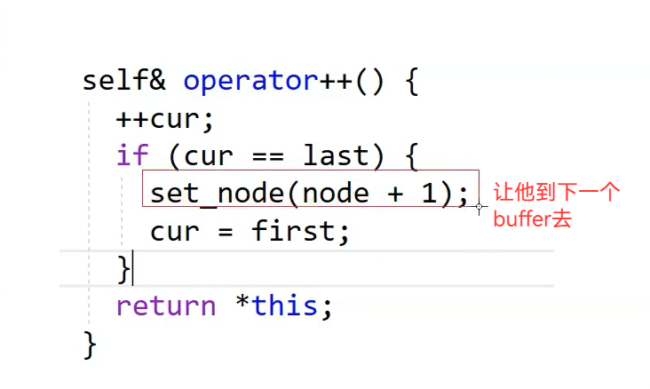 日常++迭代器就是++cur,buffer遍历结束,再找下一个buffer,Node+1就找到下一个位置数组了,解引用就是下一个buffer开始地址了,it是start拷贝给我的,把it里的start指向开始,last指向结束,cur指向第一个位置,Node指向下一个位置,迭代器就指向下一个位置了,*Node给first,buffer大小8,开始+8就是last,cur指向第一个数据位置,就可以开始访问了