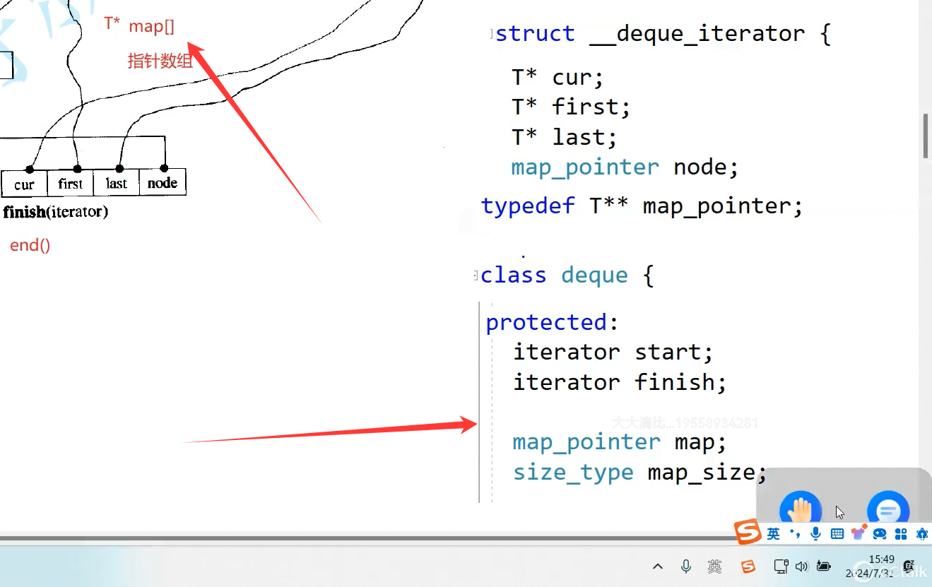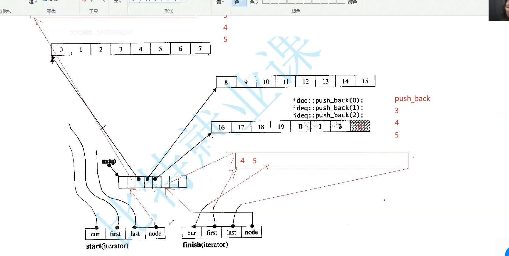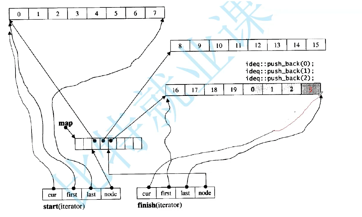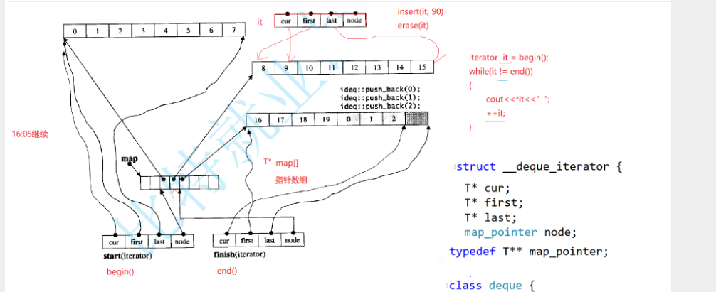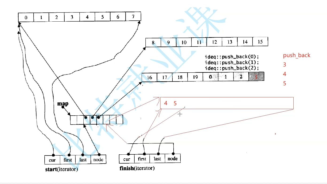 也就是头插尾插要动这个迭代器。插入3时候,first指向buffer开始,last结束,但是头插插在后面。finish指向最后一个数据下一个位置。start相当于begin,指向第一个数据,cur指向5本身