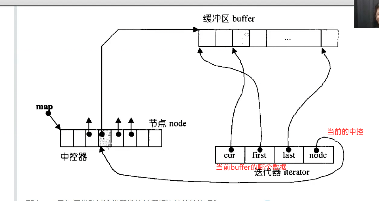 如果满了,cur=last,最后一个buffer也满了,那要新增加一个buffer,,先看中控数组满没满,中控数组满了要扩容,,finish的Node下一个位置指向新的buffer,然后调用stenode,然后firsst指向开始,last结束,然后Node指向刚刚Node下一个位置