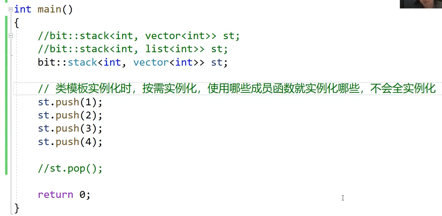 等主函数调用到了才报错,这叫按需实例化,模版实例化时候用到哪些函数实例化哪些,当不用pop就不实例化,细节不检查。