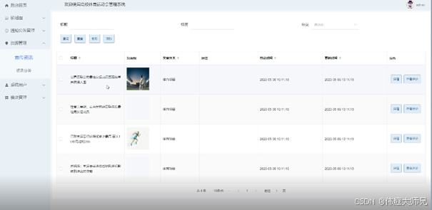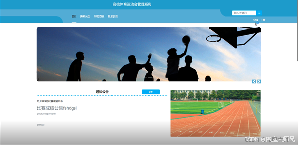 首页,管理员登陆系统后台,可以查看首页、轮播图、通知公告管理、资源管理(宣传资讯、资讯分类)、系统用户(管理员、运动员、裁判员)、模块管理(比赛信息、报名信息、取消信息、成绩信息)等功能模块,并进行相对应的操作,如下图所示。