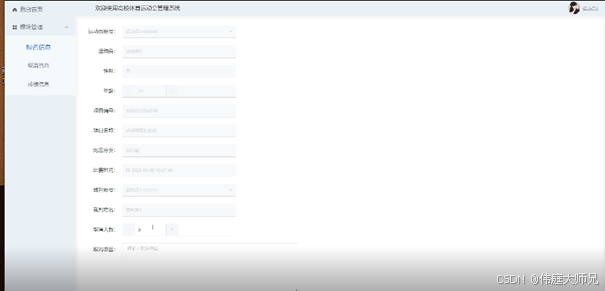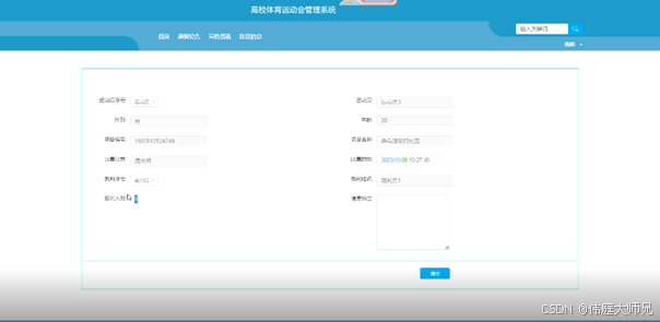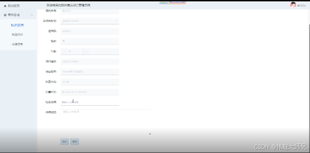 报名,运动员可以在报名页面提交运动员账号、运动员、年龄、项目编号、项目名称、比赛分类、比赛时间、裁判账号、裁判姓名、报名人数、信息备注等内容,如下图所示。
