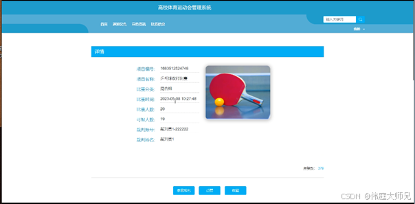 比赛信息,运动员可以查看项目编号、项目名称、比赛分类、比赛时间、比赛人数、可报人数、裁判账号、裁判姓名等信息,并可进行参与报名、点赞、收藏、评论等操作,如下图所示。