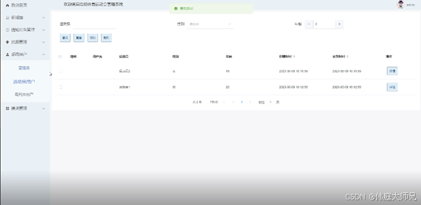 运动员用户管理,管理员可以查看昵称、用户名、姓名、性别、年龄、创建时间、更新时间等信息,并可进行新增、删除、修改、操作、详情等操作,如下图所示。