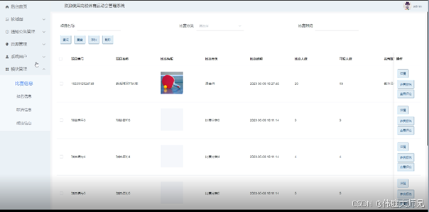 比赛信息管理,管理员可以查看项目编号、项目名称、比赛分类、比赛时间、比赛人数、可报人数、裁判账号、裁判姓名等信息,并可进行新增、删除、修改、操作、详情、参赛报名、查看评论等操作,如下图所示。