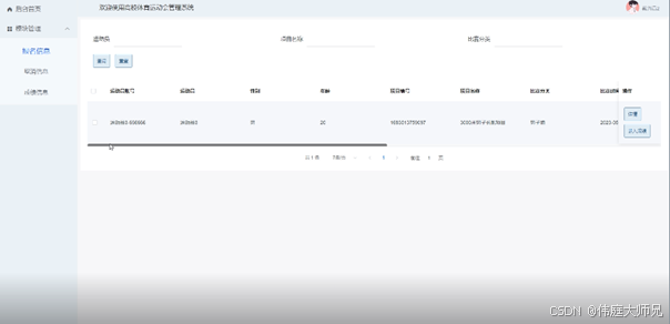 报名信息,裁判员可以在报名信息页面查看运动员账号、运动员、年龄、项目编号、项目名称、比赛分类、比赛时间、裁判账号、裁判姓名、报名人数、信息备注等内容,并进行查询、重置、详情、录入成绩等操作,如下图所示。