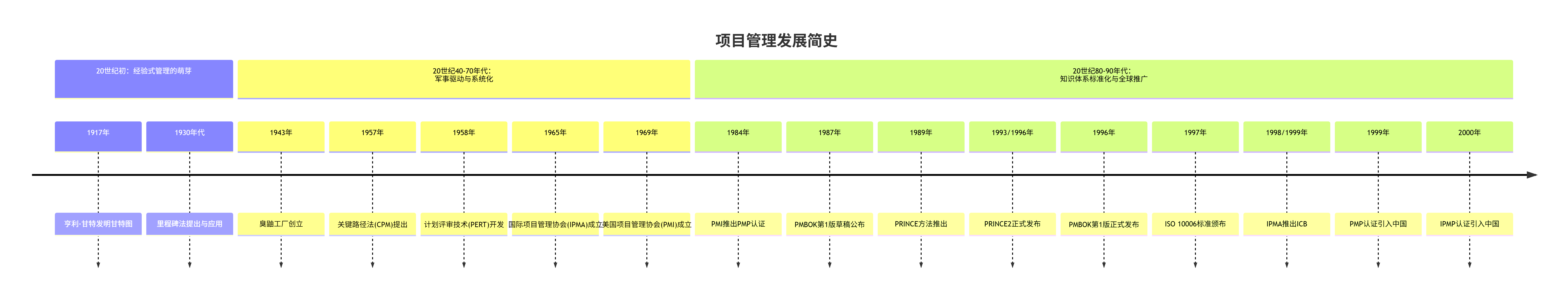 项目管理从20世纪以来,主要经历了三个阶段。包括:20世纪初的经验式管理的萌芽、 20世纪40-70年代的军事驱动与系统化方法形成 以及20世纪80-90年代的知识体系标准化与全球推广阶段。如下图所示: