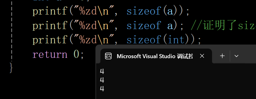 printf("%zd\n", sizeof a); //证明了sizeof不是函数,因为函数后面必须加括号