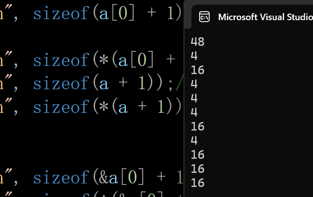 printf("%d\n", sizeof(*(a + 1)));//16 ---a + 1是第二行的地址,*(a + 1)就是第二行,计算的是第二行的大小,即16
