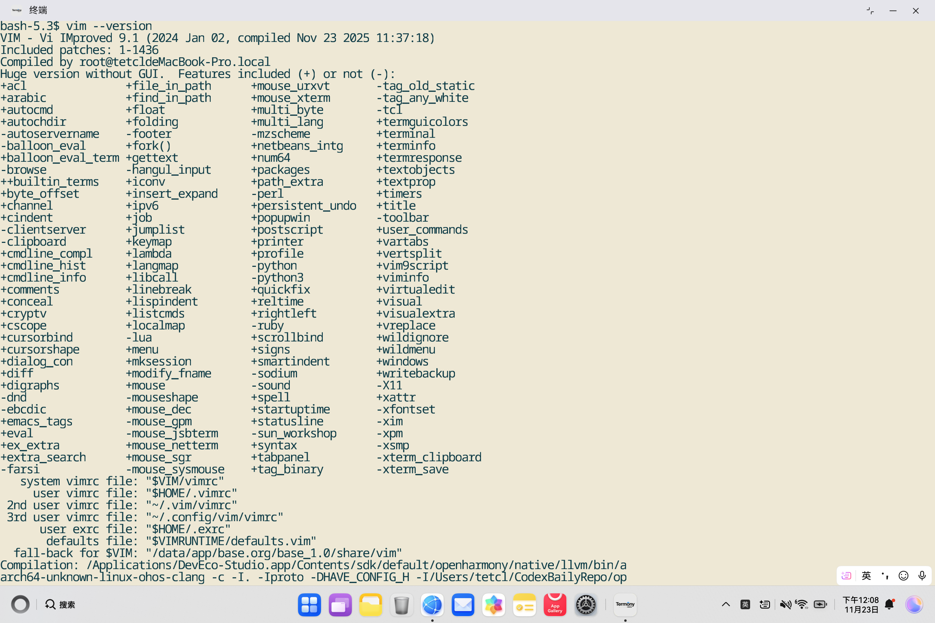 本文记录使用命令 OHOS_ARCH=aarch64 OHOS_ABI=arm64-v8a sh ./create-hnp.sh 构建 Vim 9.1.1436 的完整过程,包括环境、构建链路、关键日志、常见问题与解决方案、产物验证与重建方法,便于复现与运维。