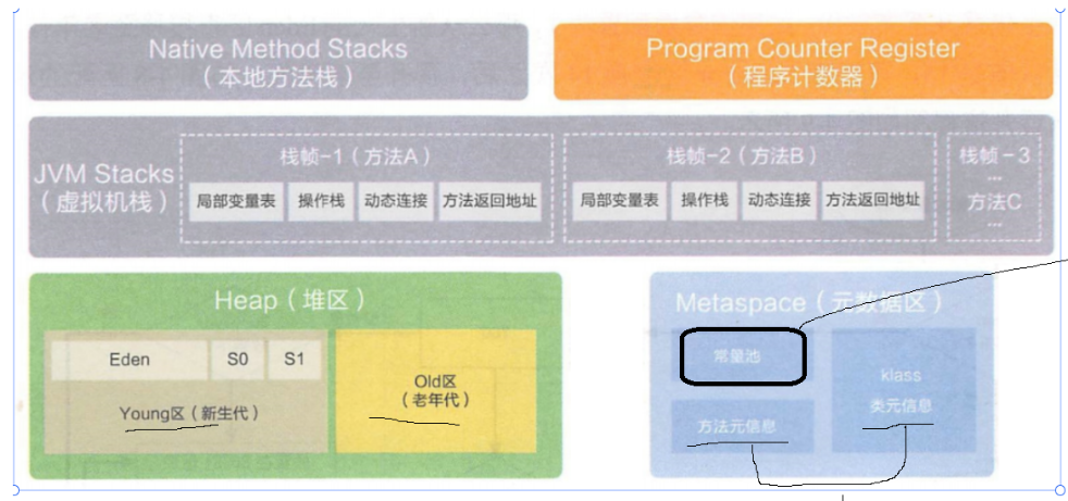 - 元数据区:类对象(类名是啥,继承了哪个类,实现了哪些接口,有哪些属性,属性都叫什么名字,属性的类型,是private还是public,有哪些方法,方法名是什么,参数列表......)