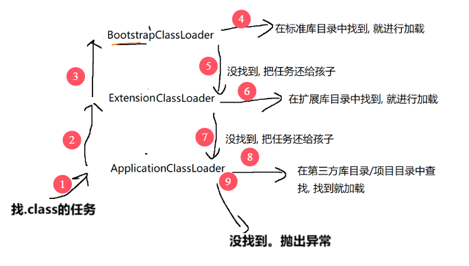 - 如果在任一层找到了目标.class,就直接加载,要是"子"搜完了也没找到,那就报错