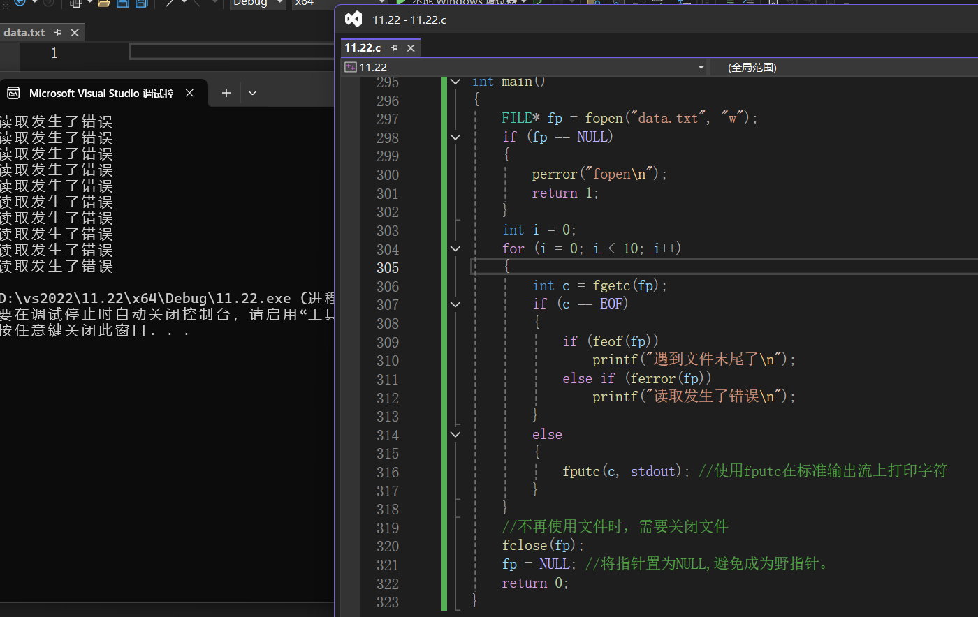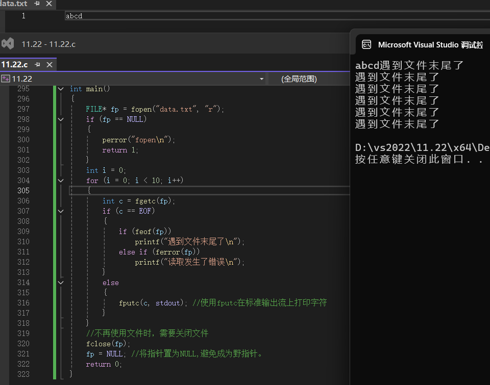 所以这个时候data就没有内容了,那我们用fgetc读取就没有用了,就会触发ferror
