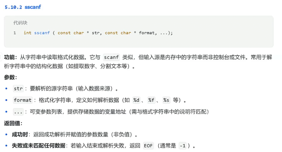 sscanf:从已有的字符串(字符数组)中,按照指定格式提取数据,赋值给变量或结构体成员,不直接从键盘 / 文件读取。