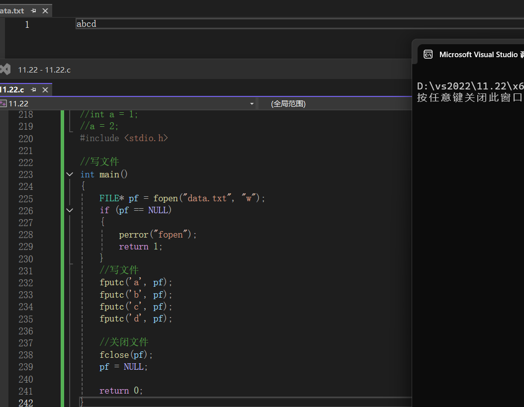 我们在打开文件fopen后写入(w):如果文件存在会把文件内容清楚,如果不存在会创建一个文件