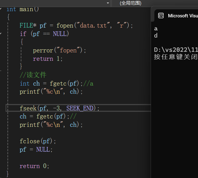 我们还可以用SEEK_END:文件末尾的位置,然后向前移动3位就是-3,打印就是d了