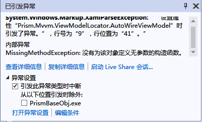 Views时,则关联到同一命名空间下类名为B+ViewModel类,例如:PrismBaseObj.MainWindow对应PrismBase.MainWindowViewModelC#//命名空间不包含Views namespace PrismBaseObj { /// <summary> /// MainWindow.xaml 的交互逻辑 /// </summary> public partial class MainWindow : Window { public MainWindow() { InitializeComponent(); } } } //命名空间不包含ViewModels namespace PrismBaseObj { class MainWindowViewModel : BindableBase { } } -
