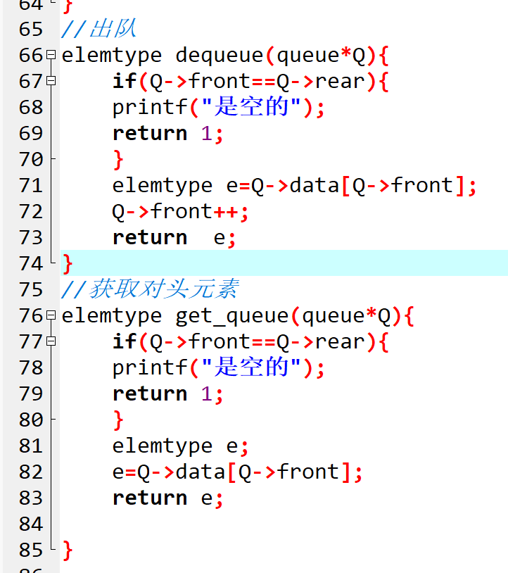 判断队列是否为空的标准很简单:当 front == rear 时,说明队列中没有元素。这里需要注意代码的小细节 ------ 函数返回值设计为 elemtype(本质是 int),返回 1 表示空,0 表示非空,同时增加打印提示,提升调试友好性: