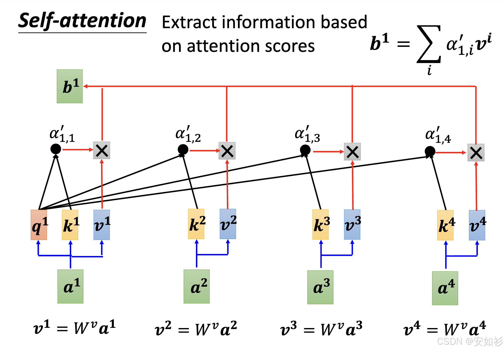 - 线性组合:根据权重,对 V V V进行加权求和,得到 Contextualized Embedding。