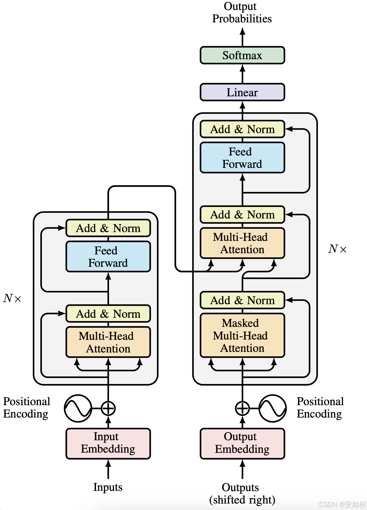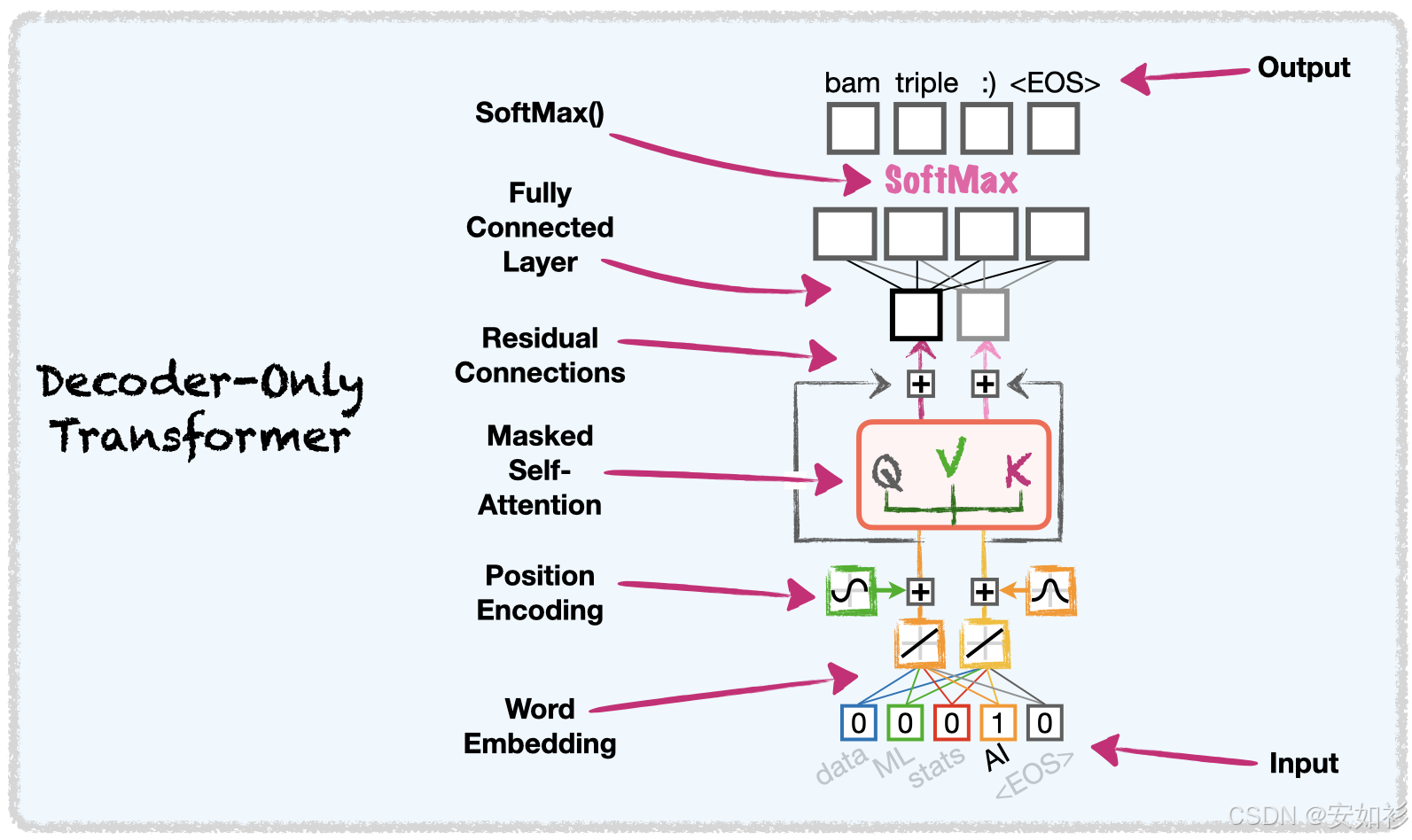原始 Transformer 架构采用 Encoder-Decoder 架构,Encoder 负责整合上下文,Decoder 用于根据上下文做文字接龙。