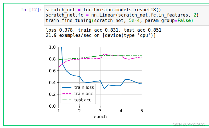 pythonscratch_net = torchvision.models.resnet18() scratch_net.fc = nn.Linear(scratch_net.fc.in_features, 2) train_fine_tuning(scratch_net, 5e-4, param_group=False)