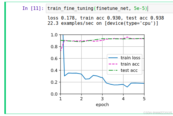 pythonpretrained_net = torchvision.models.resnet18(pretrained=True) pretrained_net.fc finetune_net = torchvision.models.resnet18(pretrained=True) finetune_net.fc = nn.Linear(finetune_net.fc.in_features, 2) nn.init.xavier_uniform_(finetune_net.fc.weight);(5)微调模型