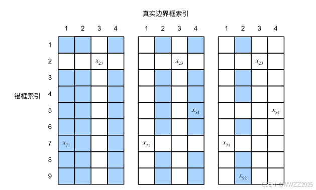 假设有4个标定好的框(横轴),算法生成了9个锚框索引(竖轴),计算IoU,取最大值如