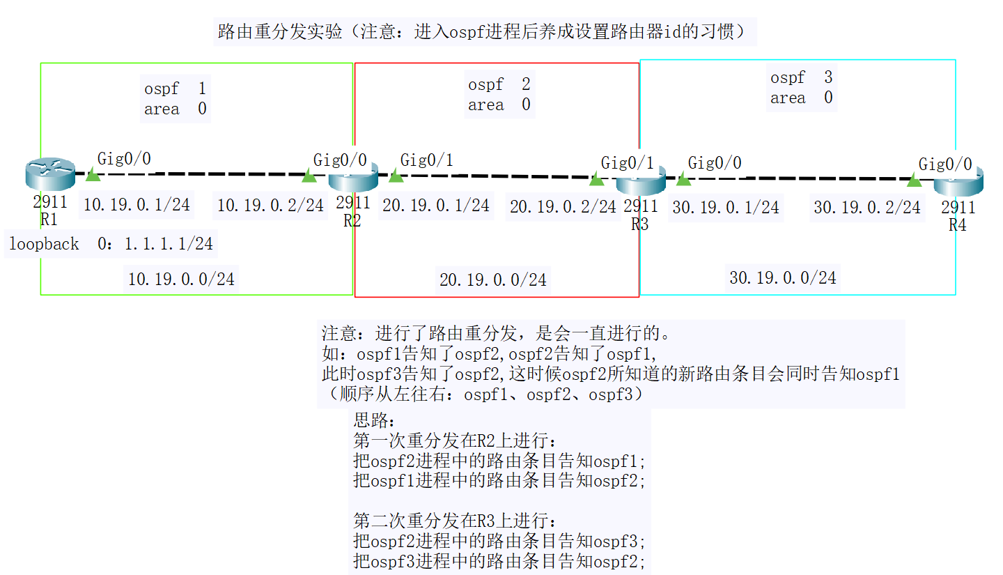 路由传递路径清晰:路由信息按照"R1←→R2←→R3←→R4"的链式路径进行传递,体现了路由重分发在边界路由器上的关键作用。