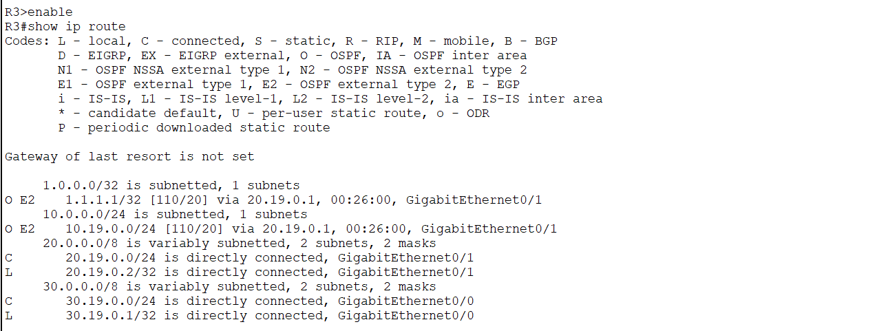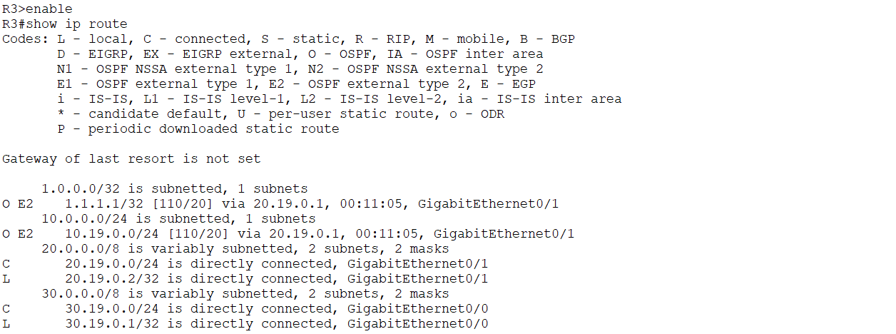 R3 路由表包含:20.19.0.0/24 (直连,OSPF 2), 30.19.0.0/24 (直连,OSPF 3),1.1.1.1/24 (重分发),10.19.0.0/24(重分发);