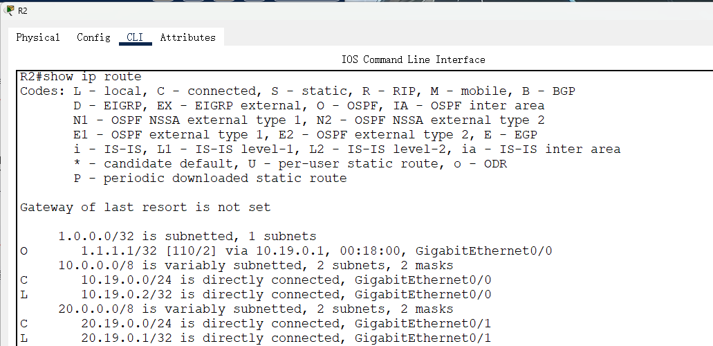 R2(config-if)#ip address 20.19.0.1 255.255.255.0 # 配置接口IP