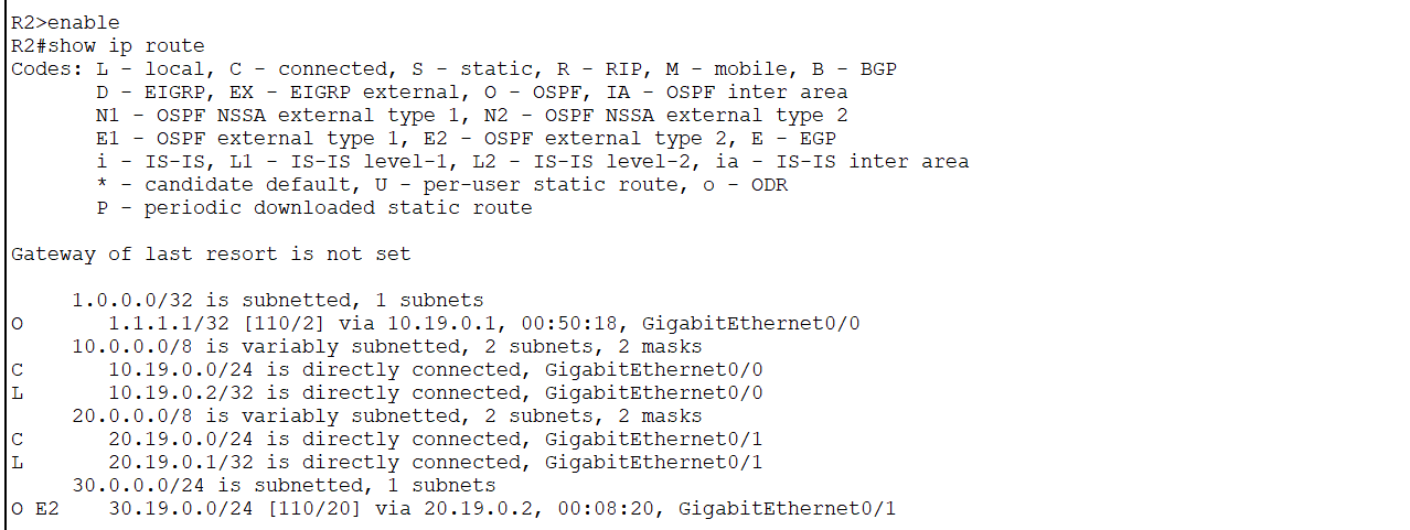 R2(config-router)#network 10.19.0.0 0.0.0.255 area 0 # 将10.19.0.0/24网段宣告到OSPF进程1的区域0