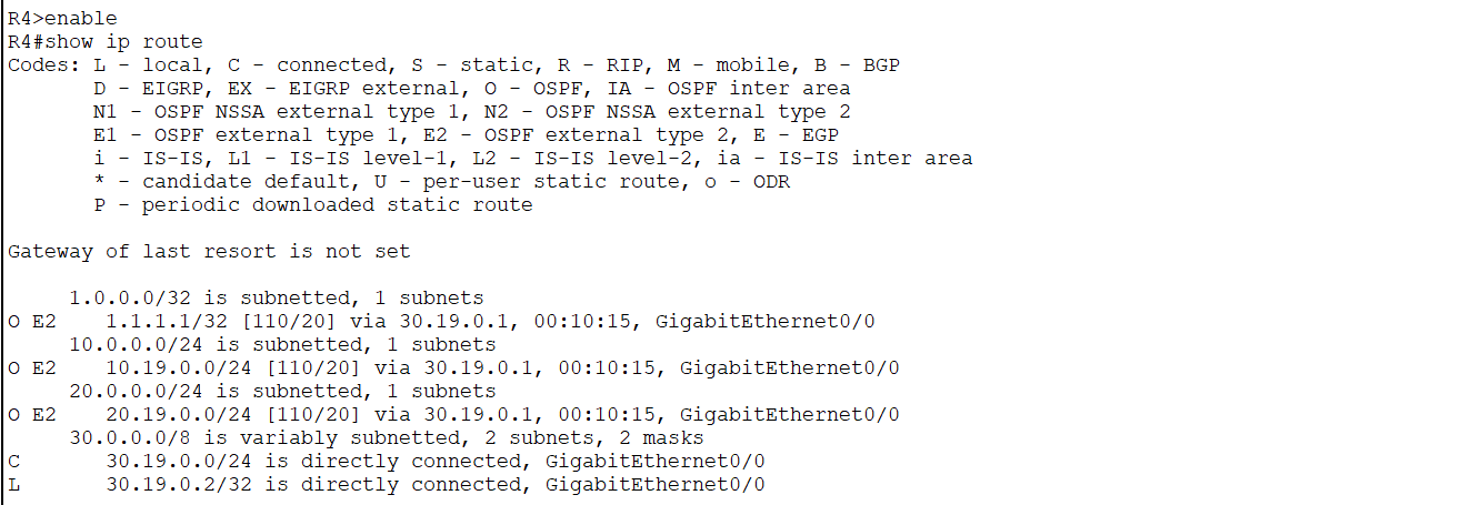 R4 路由表包含:30.19.0.0/24 (直连,OSPF 3),1.1.1.1/24 (重分发), 10.19.0.0/24 (重分发), 20.19.0.0/24(重分发);