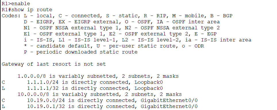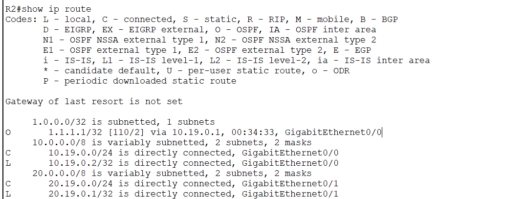 R1 路由表包含:1.1.1.1/24 (自身), 10.19.0.0/24 (直连,OSPF 1);