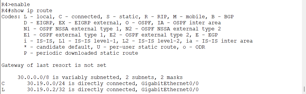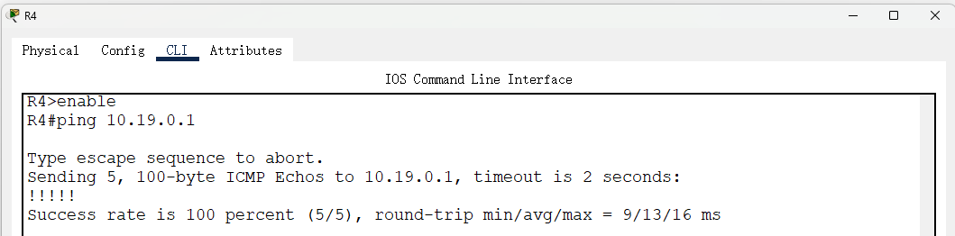 R4(config-if)#ip address 30.19.0.2 255.255.255.0 # 配置连接口IP